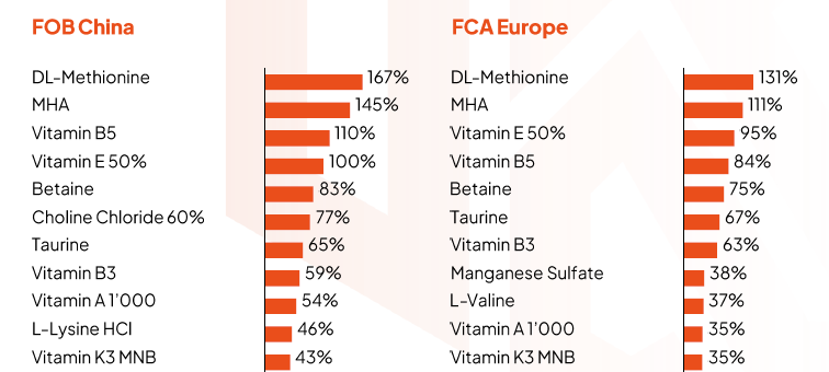 • Prices: Additives exposed to upstream petrochemical and feedstock supply chains showed the strongest price surges. The report covers price performance of 30+ feed additives year-to-date and month-over-month.