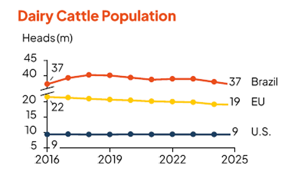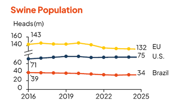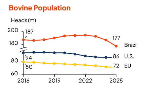 Livestock populations continued to decline in 2025, across the U.S., EU and Brazil. Overall, bovine inventories fell -3% year-on-year, while swine inventories stay stable. Main drivers are rising input costs, disease outbreaks, climate shocks and regulatory pressures.