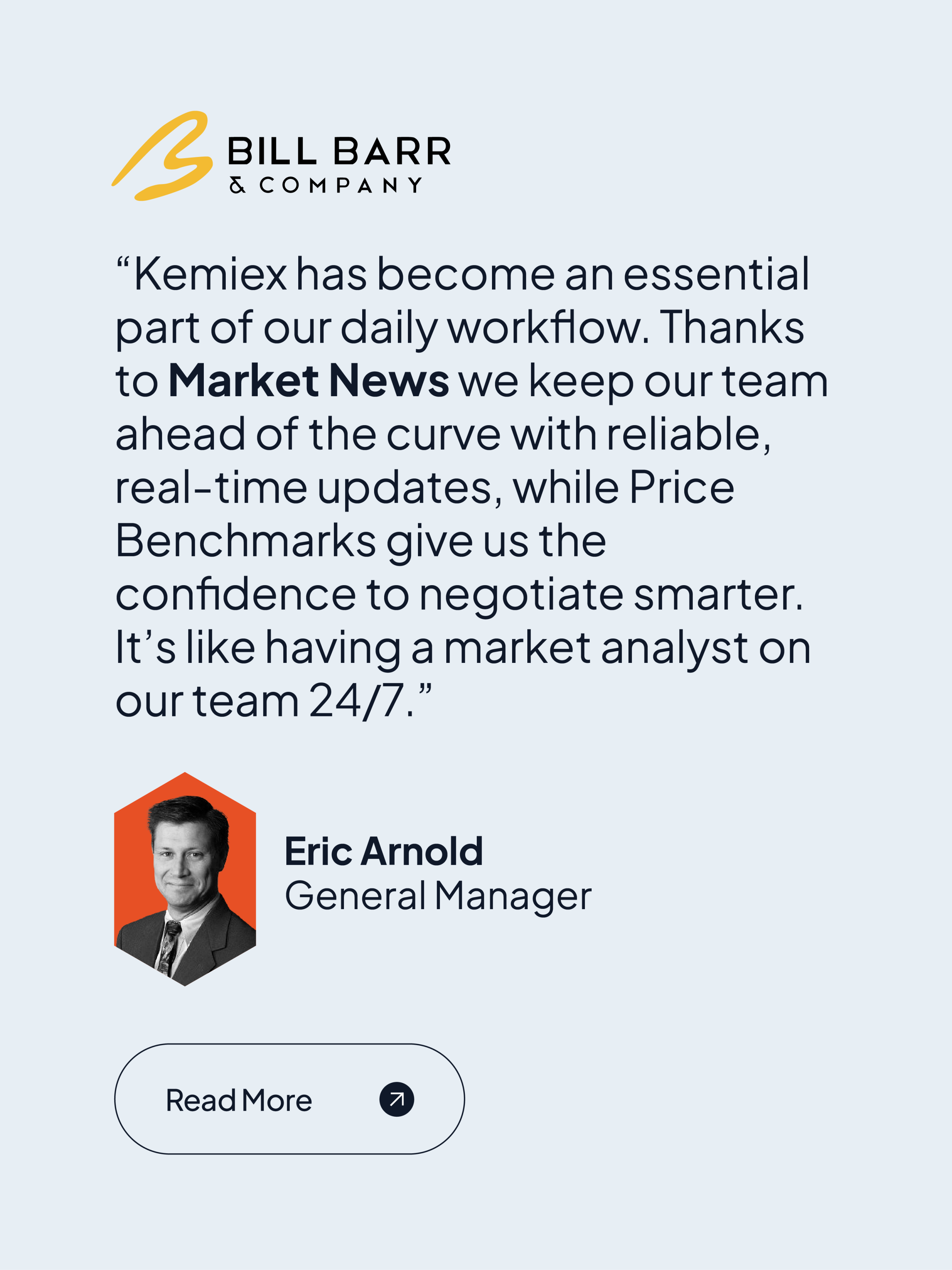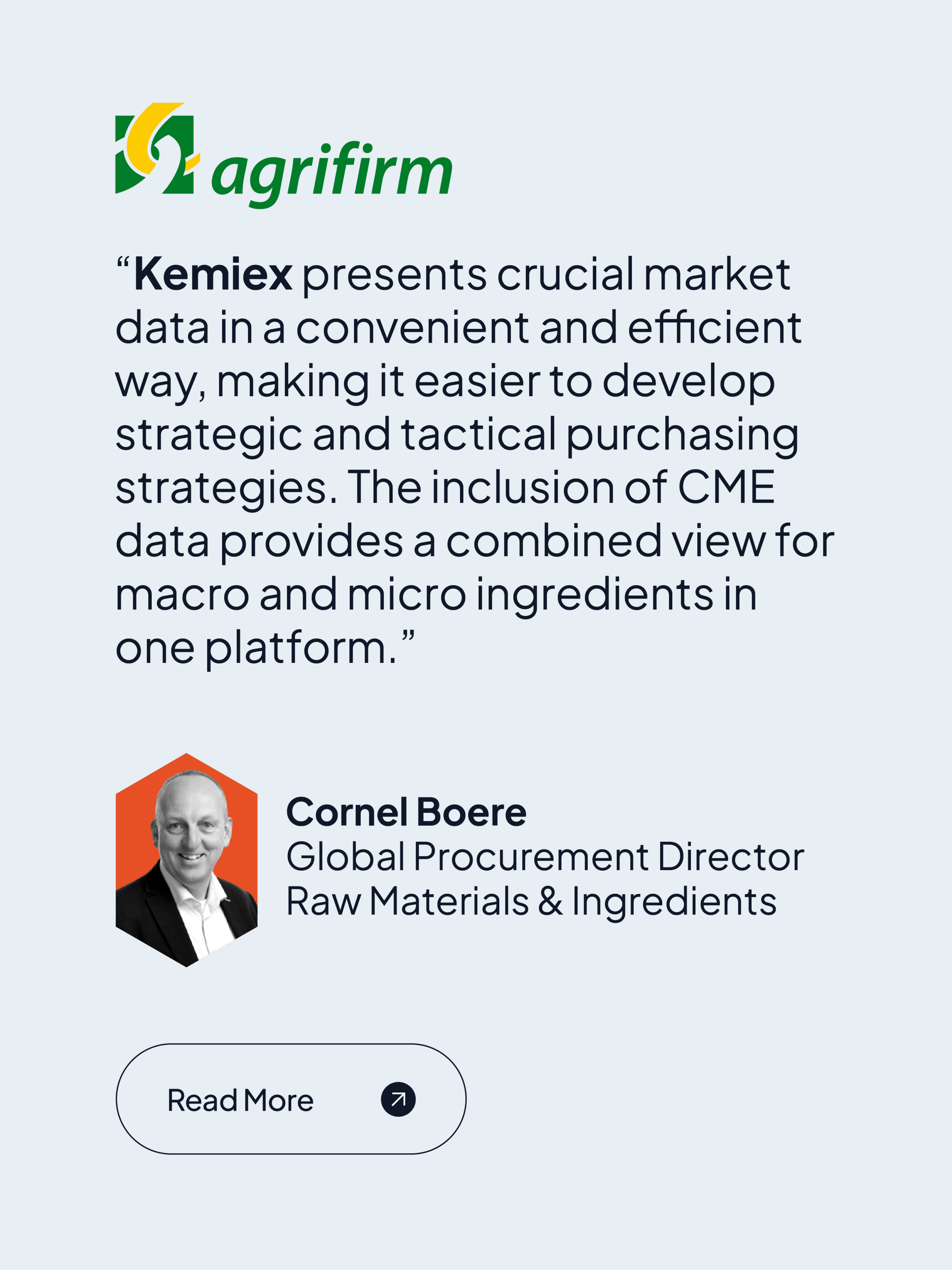 Feed procurement teams rely on Kemiex to reduce pricing uncertainty, strengthen negotiations, and anticipate market shifts before they impact margins. With clear data on trends, supply dynamics, and supplier positioning, you can protect your budget, optimize purchase timing, and build a more resilient sourcing strategy.