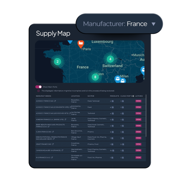 Market Radar’s Supply Map shows 3,100+ global manufacturers and exporters, while Trade Flow intelligence reveals how ingredients move across borders, giving French companies early visibility on supply risks, alternative origins, and emerging opportunities.