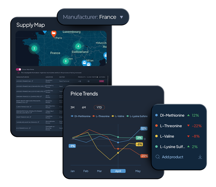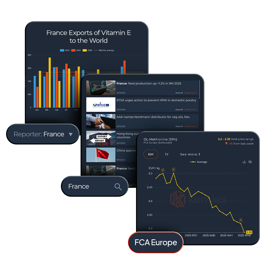 Across amino acids, vitamins, minerals, proteins and additives, France sees constant price swings driven by production changes in China, global freight costs or energy prices in Europe.