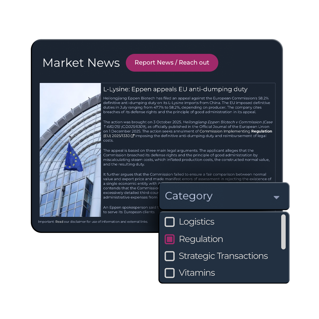 Market Radar provides trusted Market News, curated by Kemiex analysts who monitor production changes, supply shifts, disruptions, and key signals affecting ingredient availability and pricing.