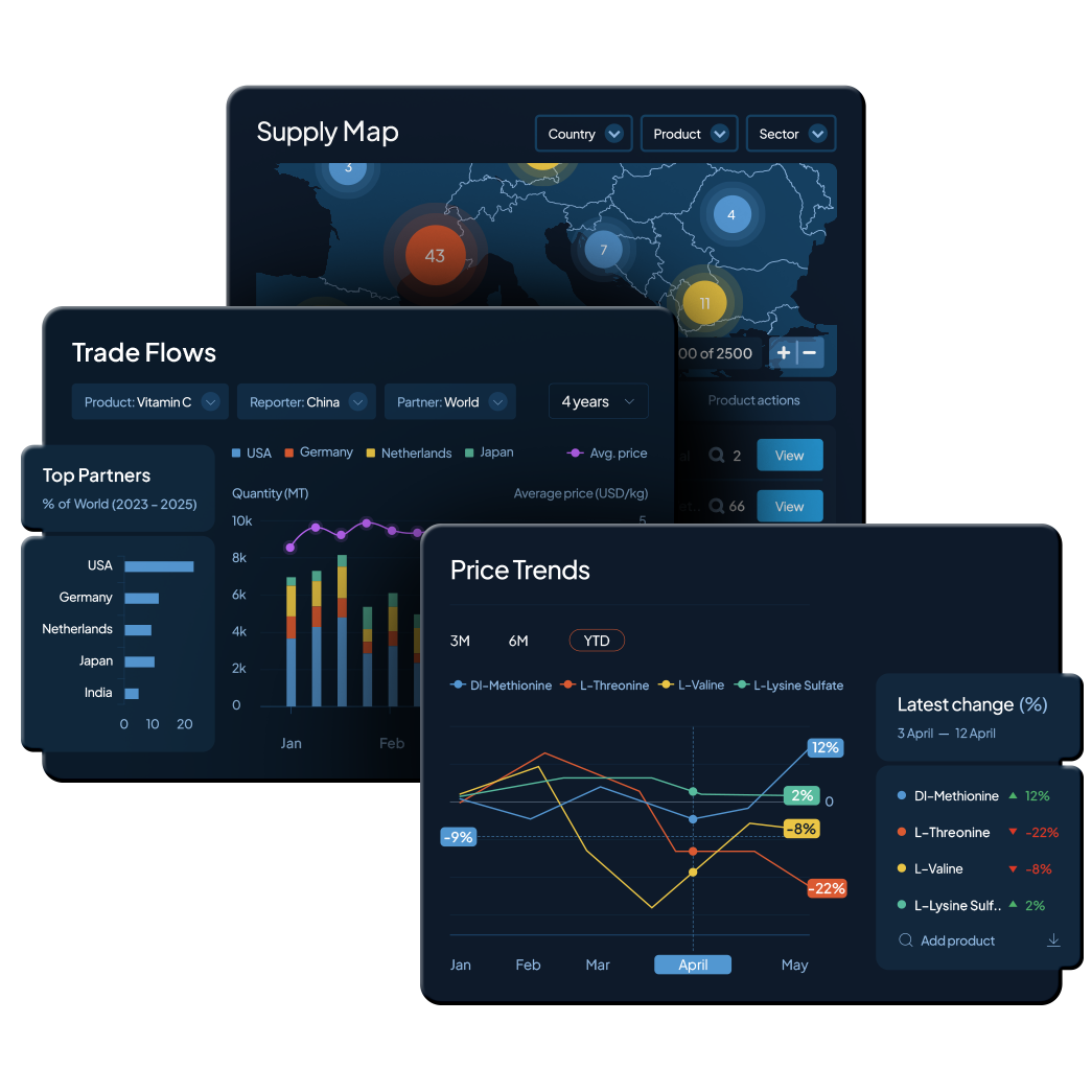 Price Benchmarks and Trends, Market News, Supply Maps, Trade Flows are generated using proprietary models and analyst expertise so users receive reliable, decision-ready intelligence.