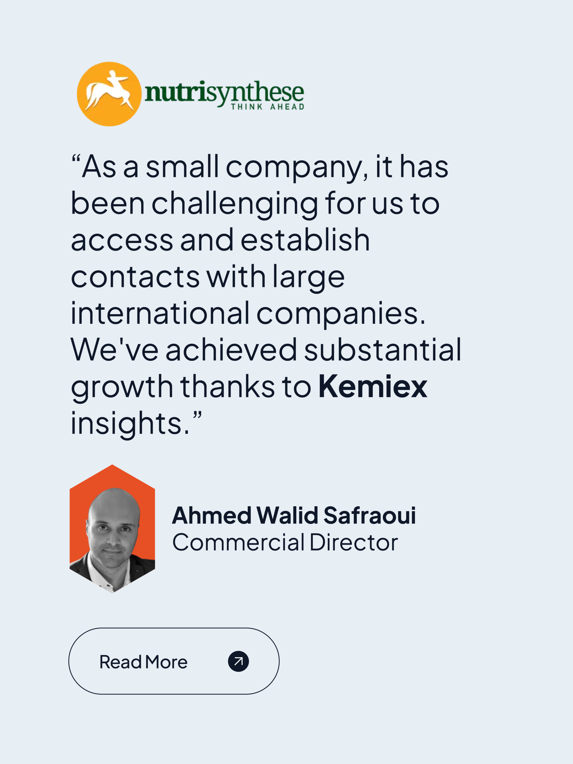 Kemiex provides real-time price benchmarks, market news, and trade-flow insights for ingredients that shape supply chains worldwide – from amino acids and vitamins to minerals, proteins, and specialty additives.