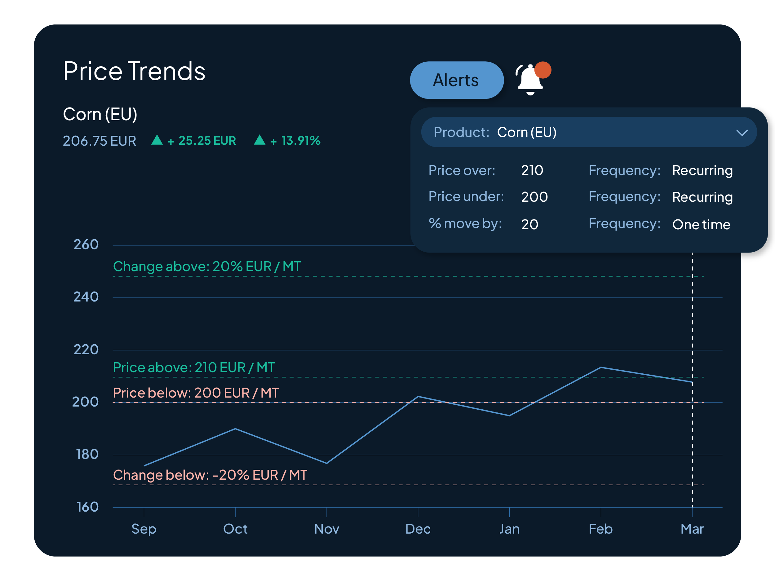 Set price thresholds or percentage moves per product and get notified the moment markets cross your limits.